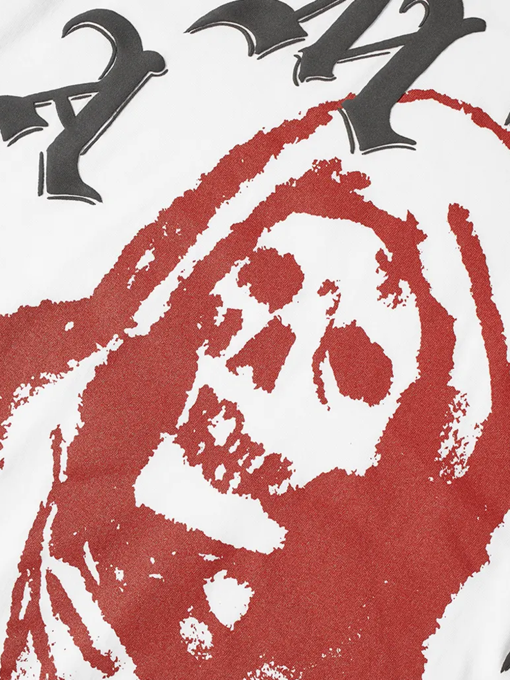 The Amiri Wes Lang T-Shirt in White unites high-end fashion with striking gothic artistry. Crafted from 100% cotton, this crewneck tee offers superior comfort and durability. Featuring Wes Lang’s signature grim reaper motif beneath the iconic AMIRI logo, it delivers a distinctive, artistic edge that reflects the unique collaboration between two L.A. legends. Perfect for those who appreciate bold, contemporary design with a mysterious flair.