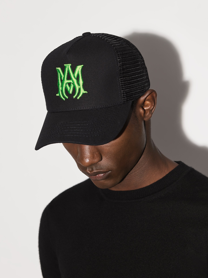 The Amiri MA Logo Embroidered Trucker Cap, crafted in Los Angeles, combines durable 12 oz duck canvas with breathable mesh for superior comfort and ventilation. Showcasing the signature Mike Amiri motif, this cap features a mesh double snap-back closure that allows for an adjustable, one-size-fits-most fit. Made from 100% cotton with a mesh back and finished with a 100% Tencel lining, it ensures long-lasting wear and moisture-wicking properties—an ideal fusion of style, function, and expert craftsmanship.