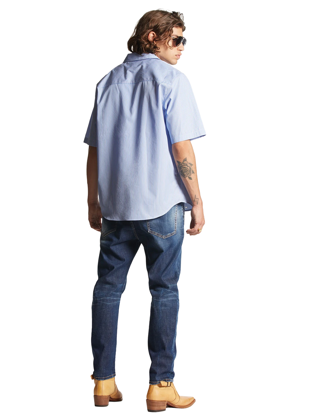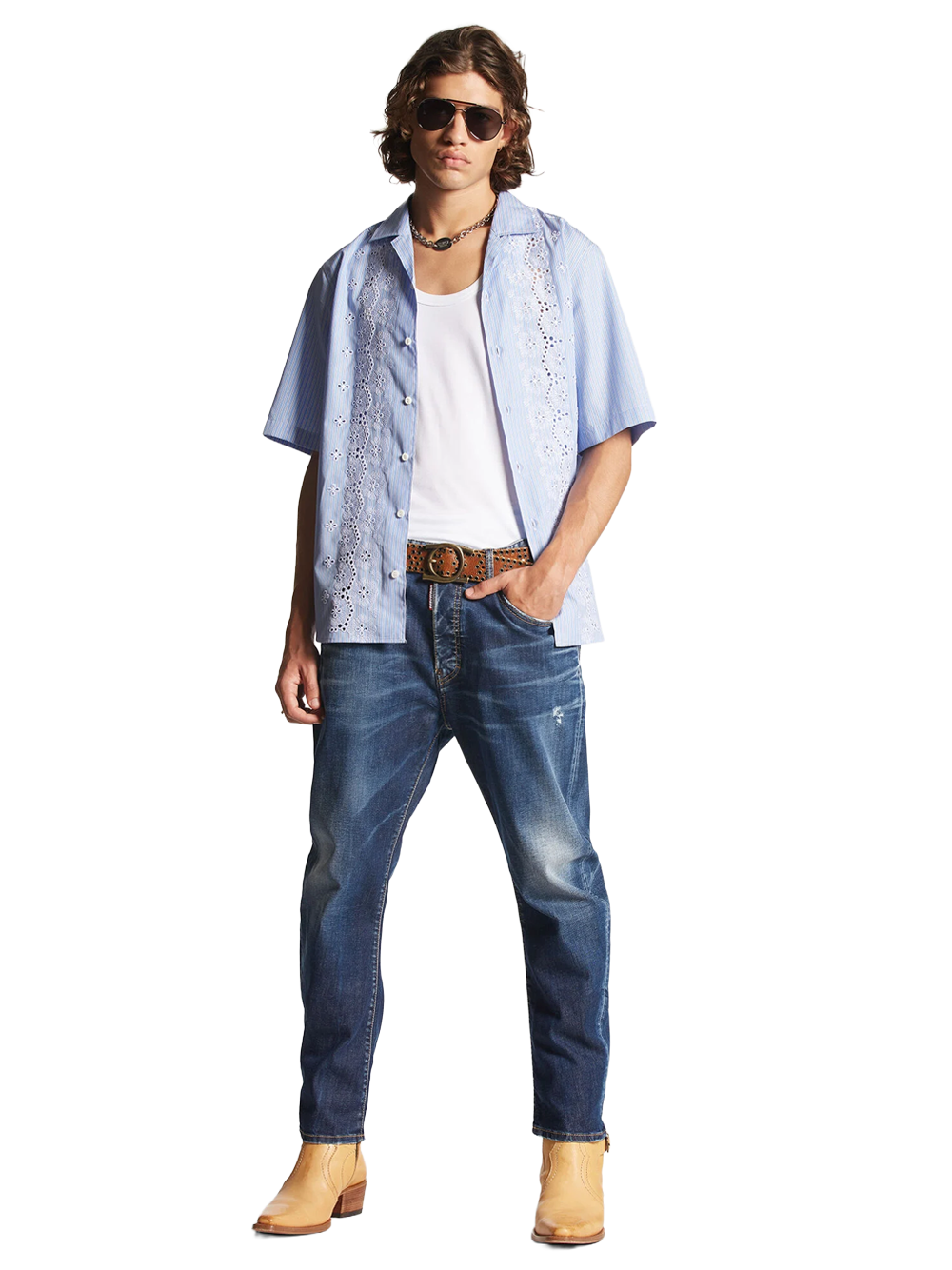 Dsquared2's Cool Guy jeans epitomise Italian craftsmanship with a distinctly contemporary edge. Cut in a regular fit from stretch denim, these dark wash jeans feature the label's signature used finish and strategically placed worn patches for an intentionally lived-in aesthetic. The five-pocket construction is anchored by a button waistband, whilst contrasting twin-needle stitching and the iconic Dsquared2 logo label sewn to the back flap deliver unmistakable brand presence. Made in Italy, these jeans balance premium construction with effortless cool.