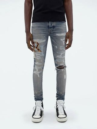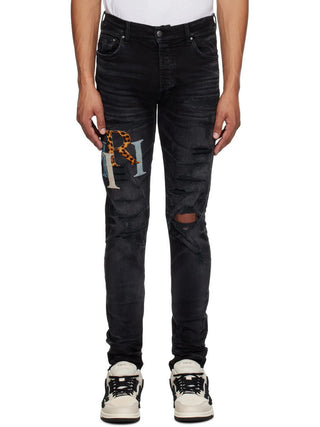Amiri Leather Staggered Logo Ripped Jeans in Black