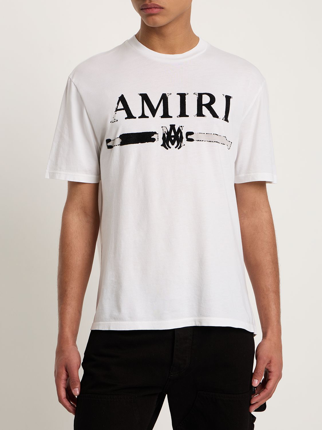 The Amiri 'Ma Bar' Applique T-Shirt in White is a stylish representation of L.A.’s rock’n’roll identity, synonymous with the AMIRI brand. This tee pays tribute to its namesake founder, Mark Amiri, with a gothic-esque monogram emblem underneath the signature logo, offering an authentic brand finish. Crafted from 100% cotton, it features a crewneck and printed branding, making it a perfect casualwear classic.
