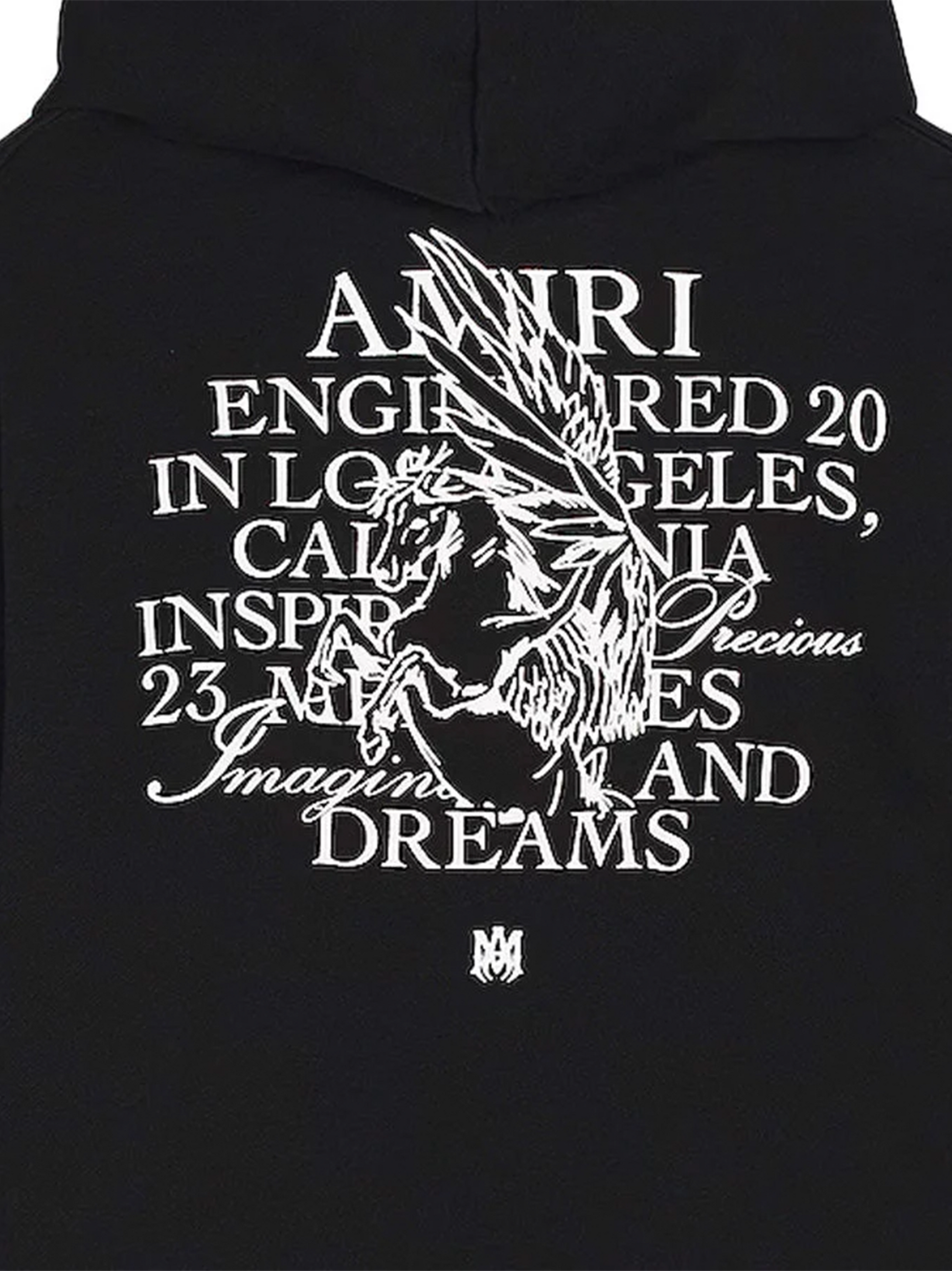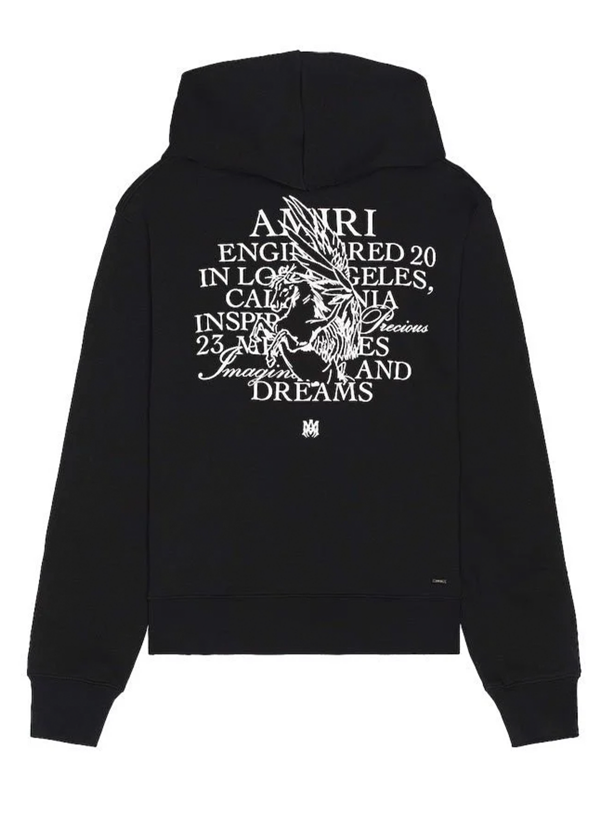 The Amiri Precious Memories Hoodie in Black effortlessly blends L.A. streetwear with rock'n'roll edge. Expertly crafted from cotton, this hoodie features the brand's iconic Precious Memories motif in contrasting white, making it a unique and stylish addition to your wardrobe. Elevate your look with this meticulously designed piece.