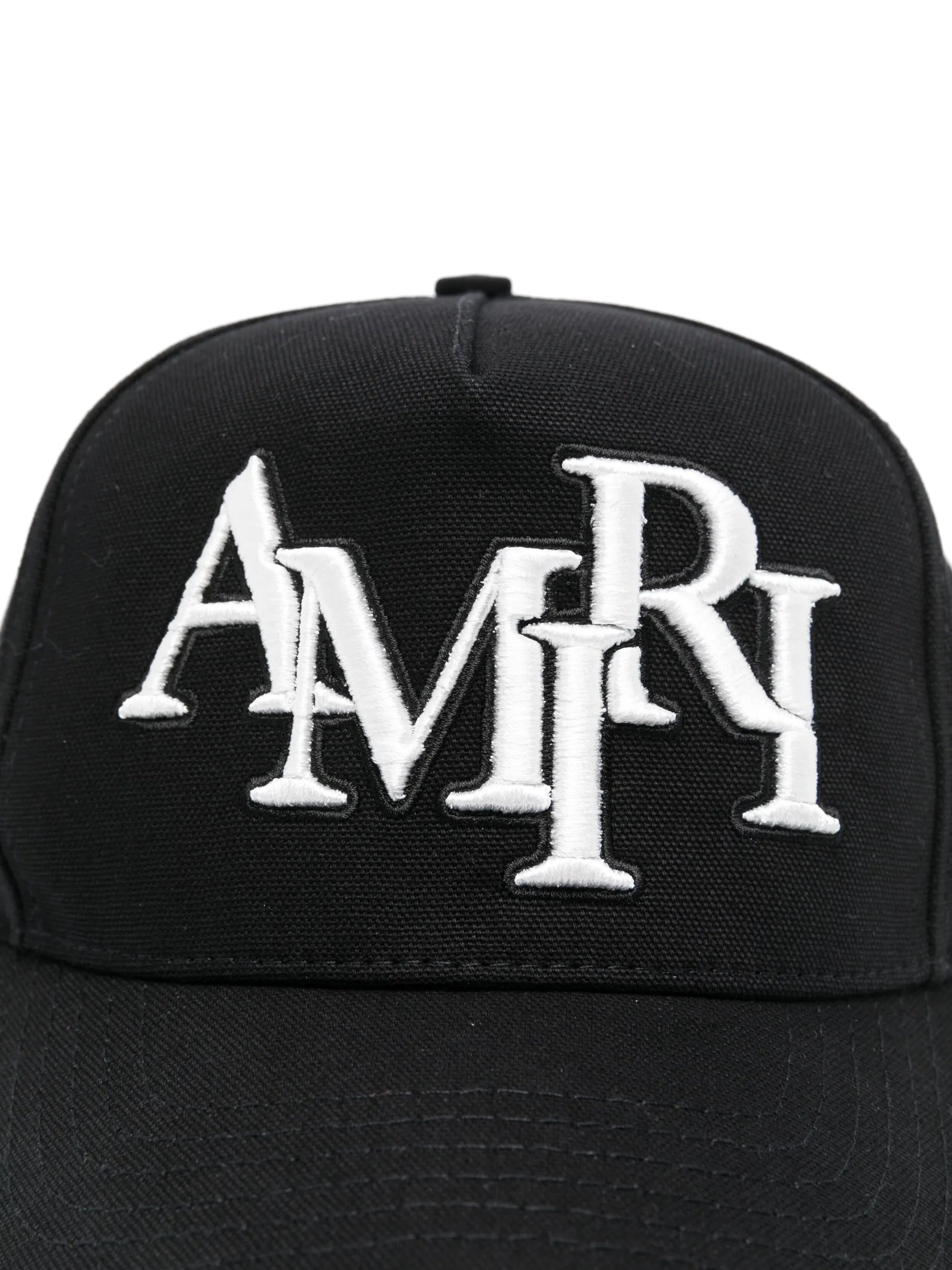Amiri trucker cap features an embroidered staggered logo. Curved brim with mesh back panel, including adjustable strap.