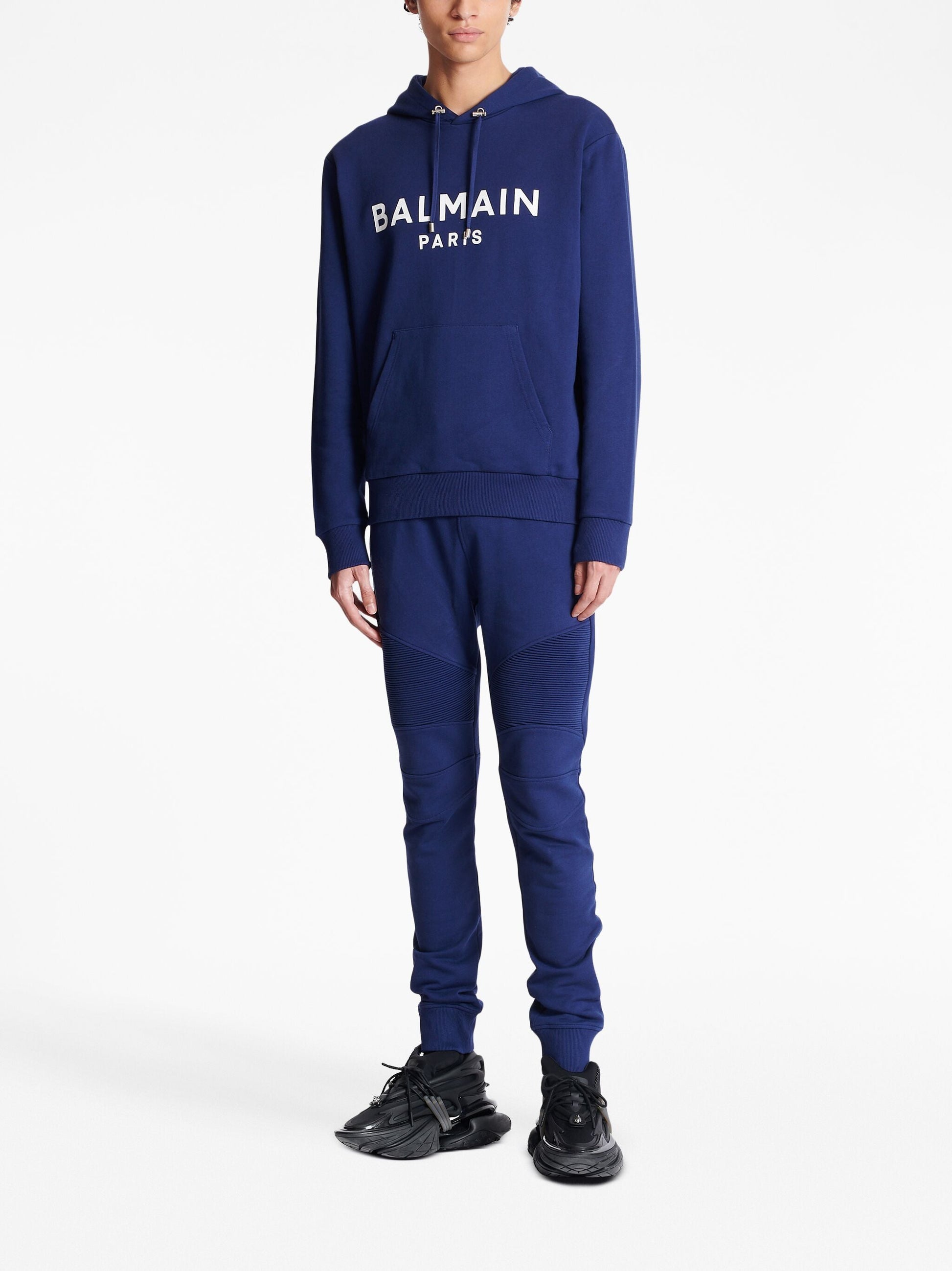 Balmain's Paris hoodie is a stylish hooded sweatshirt with a straight cut design. It features ribbed detailing and an adjustable drawstring neckline for a comfortable fit. The long sleeves and kangaroo pocket add a practical touch, while the chest logo adds a subtle branding element. Perfect for casual, everyday wear.