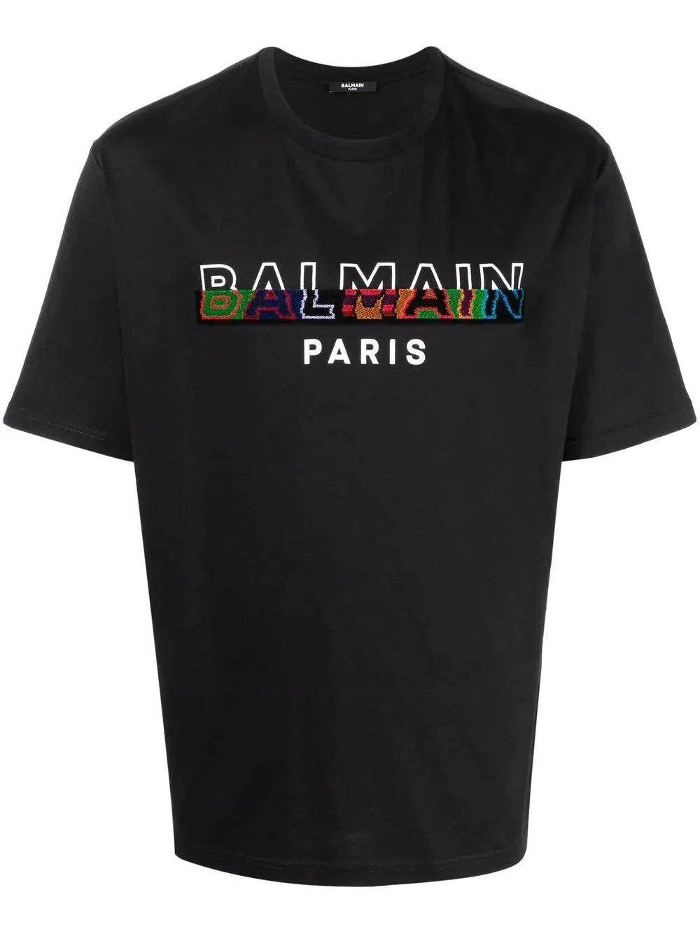 Balmain presents a twist on a logo-print T-shirt here, with the addition of textured branding. In multicolour tones, this detail provides an eye-catching contrast to the piece's black-hued construction.