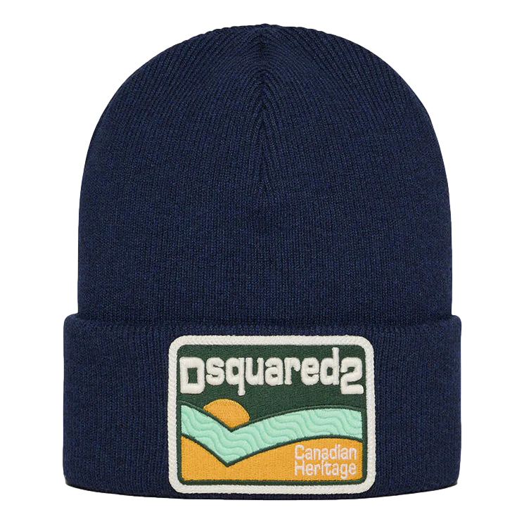 This 100% wool beanie features a turn-up hem and an exquisite hand-embroidered patch reading "DSQUARED2 Canadian Heritage," authenticating its Italian origin.