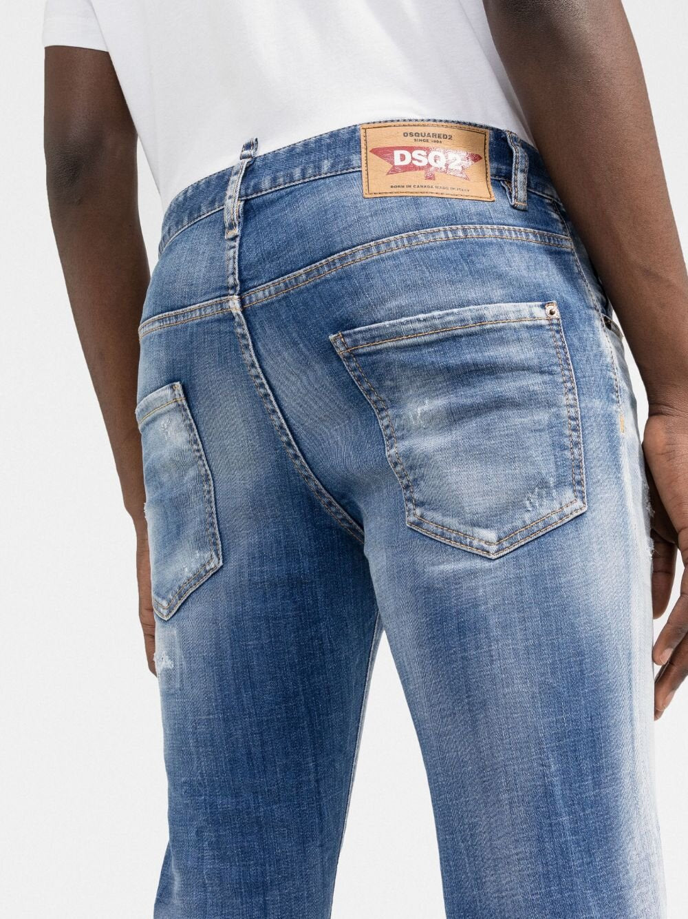 Showcasing a slim-fit silhouette, these Dsquared2 jeans are characterised by an overall distressed effect. With ripped detailing throughout, the design is crafted in a faded blue cotton fabrication and punctuated with a logo patch to its rear.