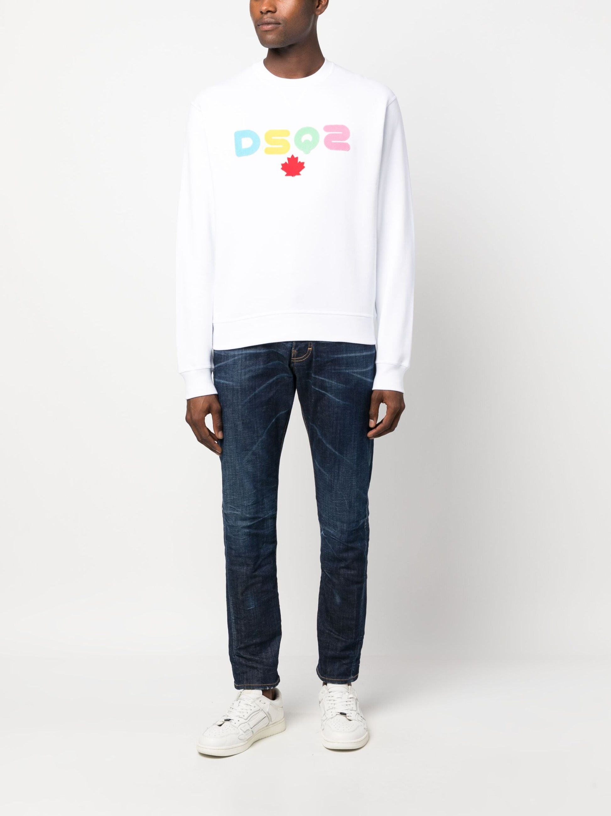 Dsquared2 Multi Coloured DSQ2 Logo White Sweatshirt. Dsquared2 White Crew Neck Jumper. Cool Fit Style, Regular Fit, Fits True To Size. Elasticated Neck, Sleeve Ends and Bottom. Large Multi Coloured Branded Logo, 100% Cotton, Made In Italy. S74GU0731 S25516 100W