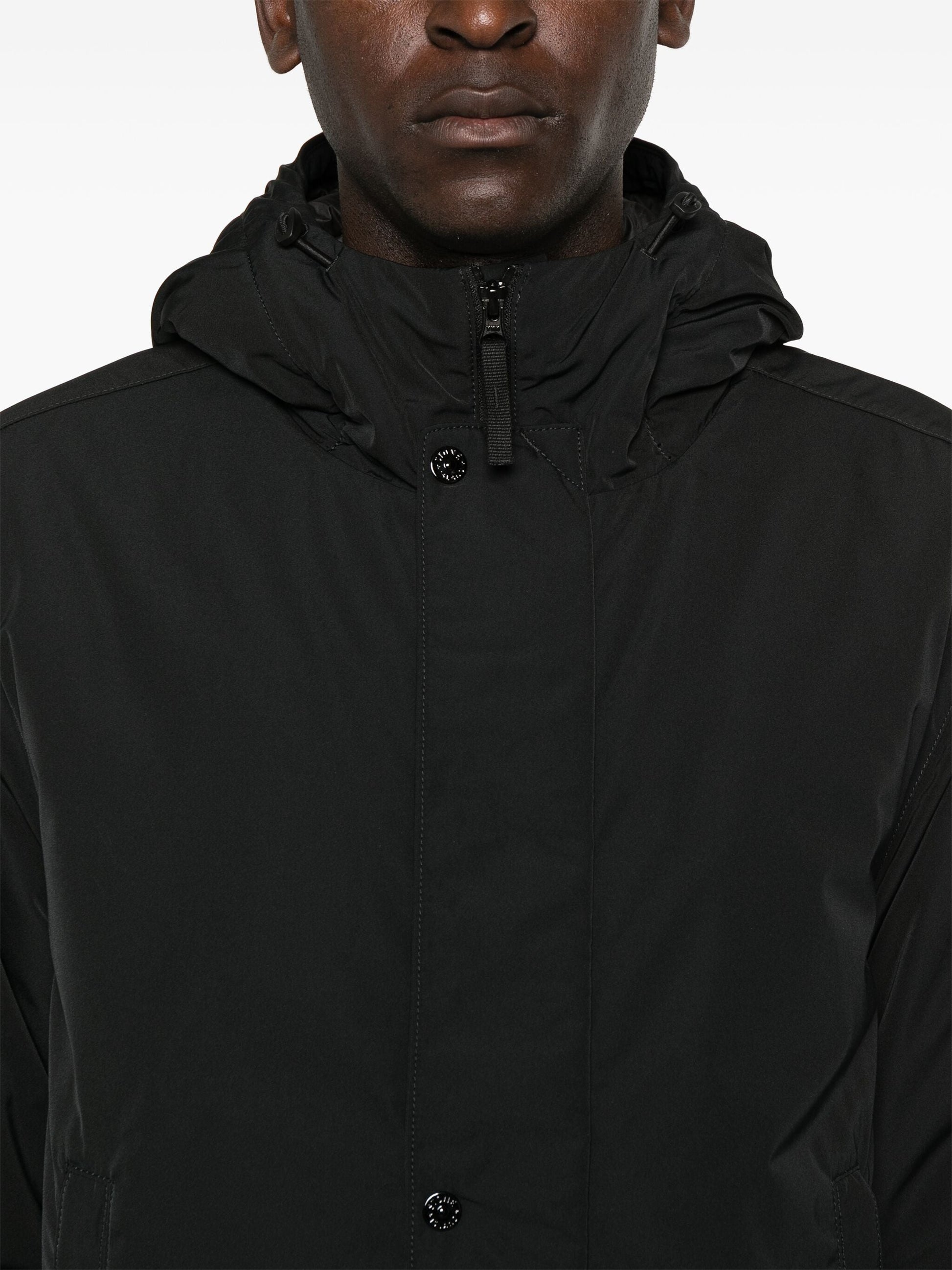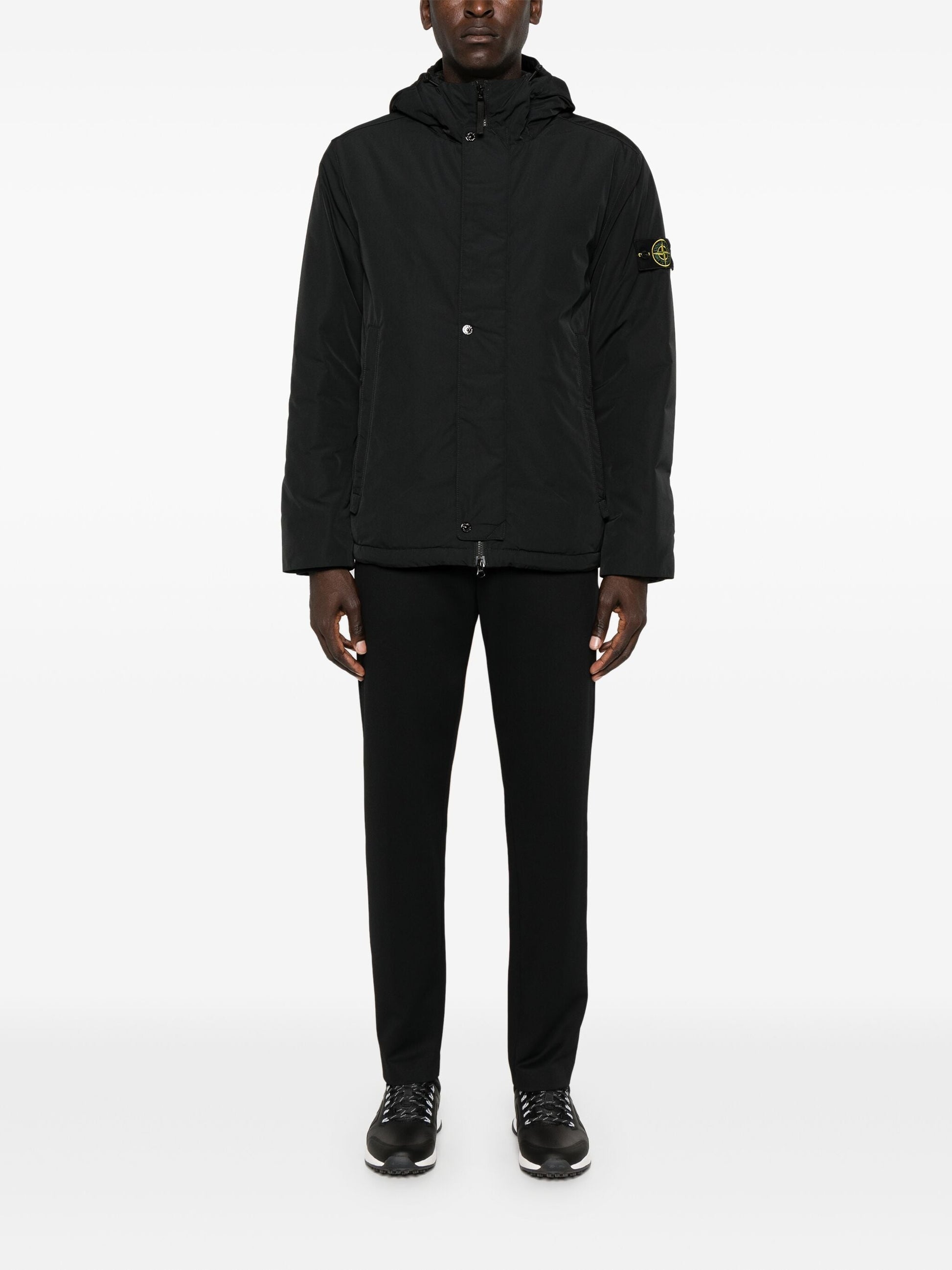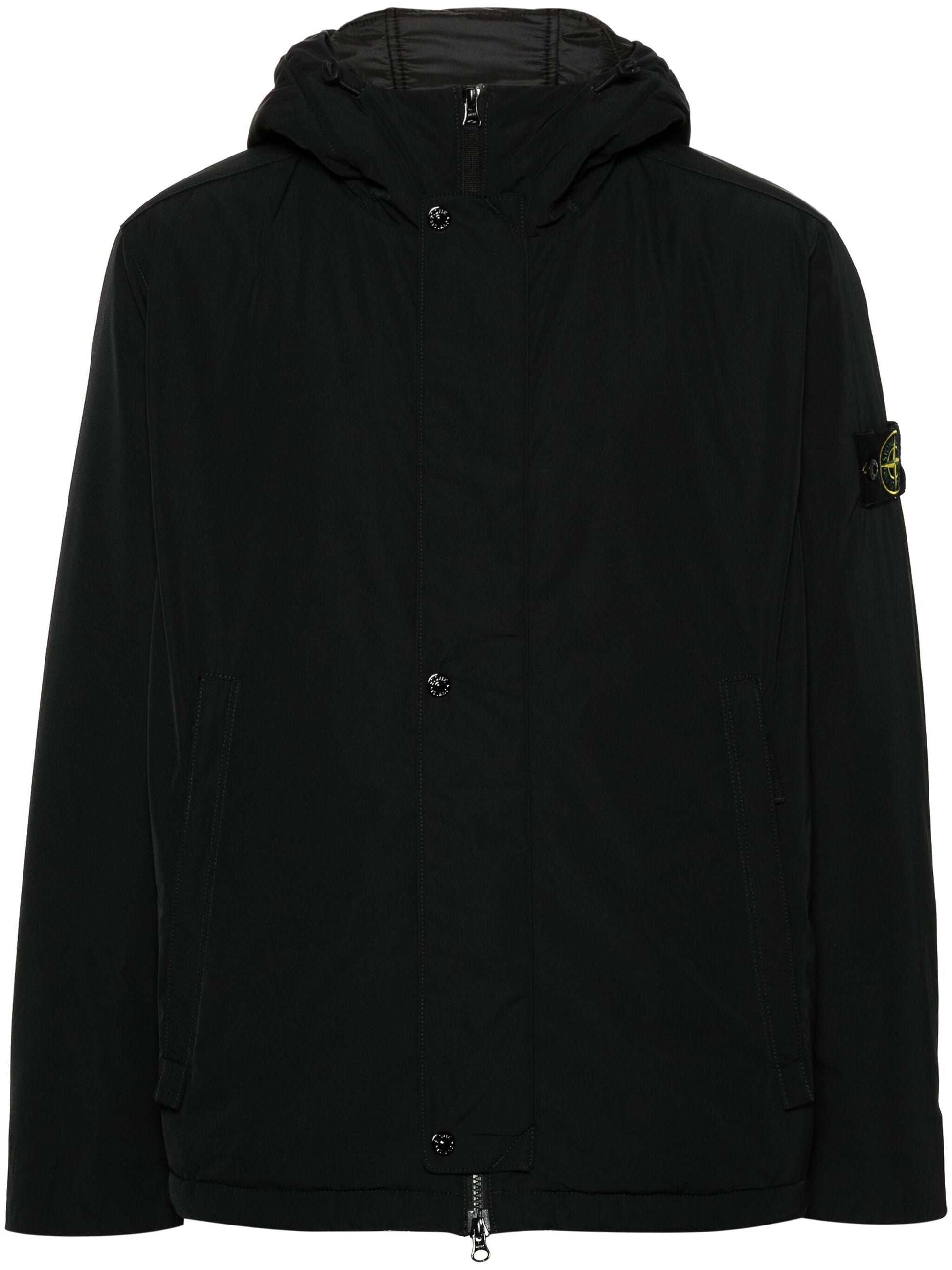 Stone Island plaster polyester jacket. Padded plaster tech fabric, hood with drawstring, concealed two-way zip and snap button closure, two front zip pockets, logo patch on the sleeve, straight hem.